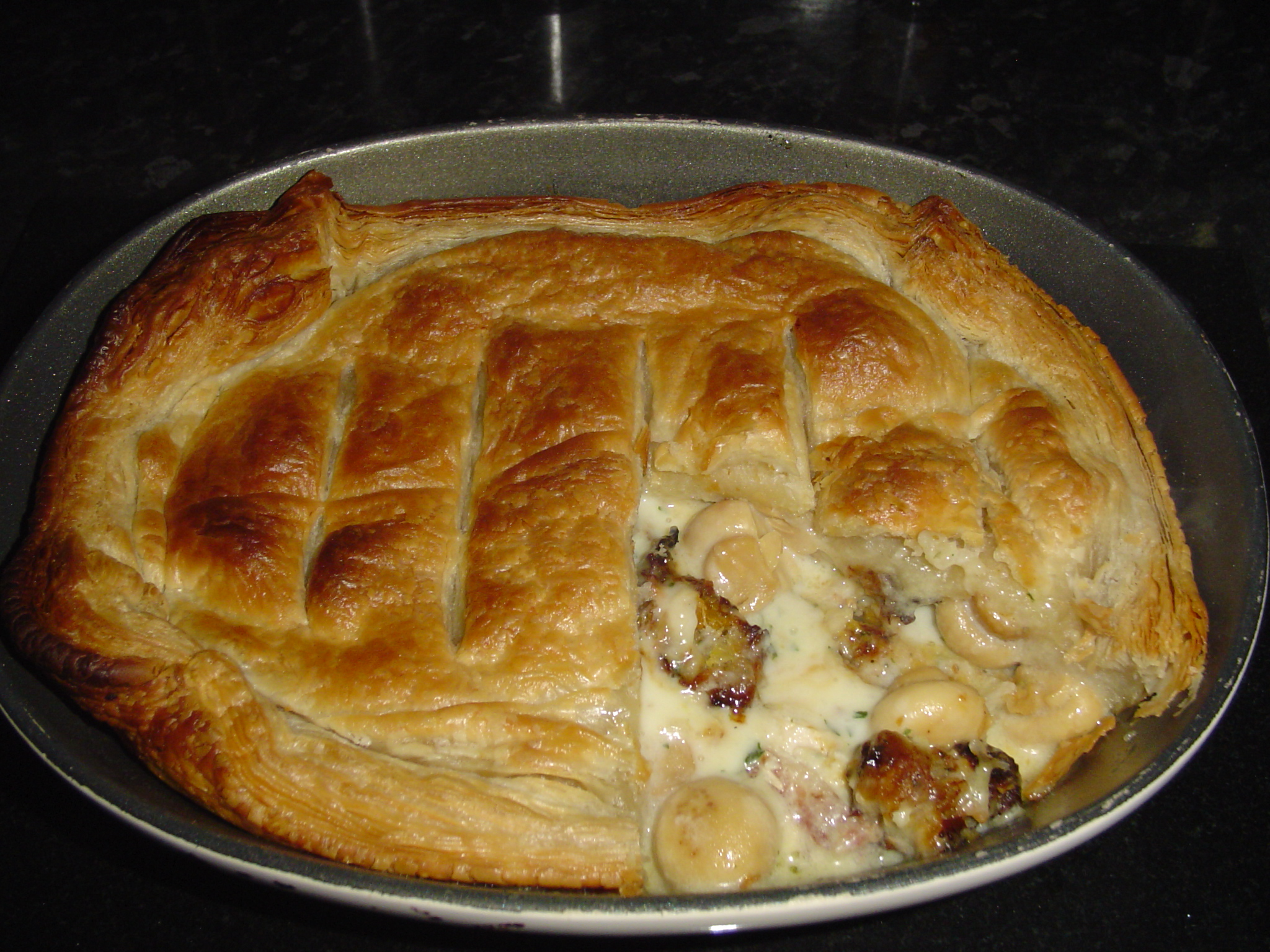 The evening meal was our final bitsa meal of the holiday. Puff pastry, chicken breast, sausage meat and mushrooms combined with some garlicky white sauce and baked in a hot oven for 30 minutes. Not healthy, but hot.